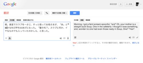 CDZAのクリップのアイデアを参考にして、Google翻訳を使って実験してみた。日本の文学作品の冒頭をGoogle翻訳で英語に翻訳して、その英文を再度Google翻訳で日本語に変換するとどうなるか?と言う実験だ。まず、太宰治の「斜陽」。 【原文】朝、食堂でスウプ…